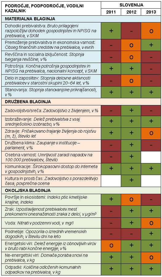Blaginjo oziroma njene spremembe v Sloveniji izkazujemo z vodilnimi kazalniki po področjih in podpodročjih za leta 2011, 2012 in 2013. Napredki (+), nazadovanja (-) in stagnacije (o) so ocenjene medletno oziroma so prikazane tako, da kažejo gibanja v ocenjevanem letu v primerjavi s predhodnim. Znak za stagnacijo ne pomeni nujno, da so rezultati v tekočem letu povsem enaki kot v preteklem, temveč da so spremembe tako majhne, da ne odražajo zanesljivega napredka ali nazadovanja. Globina napredkov oziroma nazadovanj je medletno po posameznih kazalnikih različna, zaradi letnih nihanj pa je zanesljivejše ocene sprememb blaginje mogoče zaznati šele v daljšem časovnem obdobju.